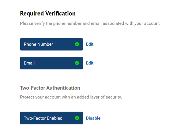 Before you proceed you must verify both your Email Address and Phone Number. Setting up 2FA authentication is highly recommended but not mandatory.